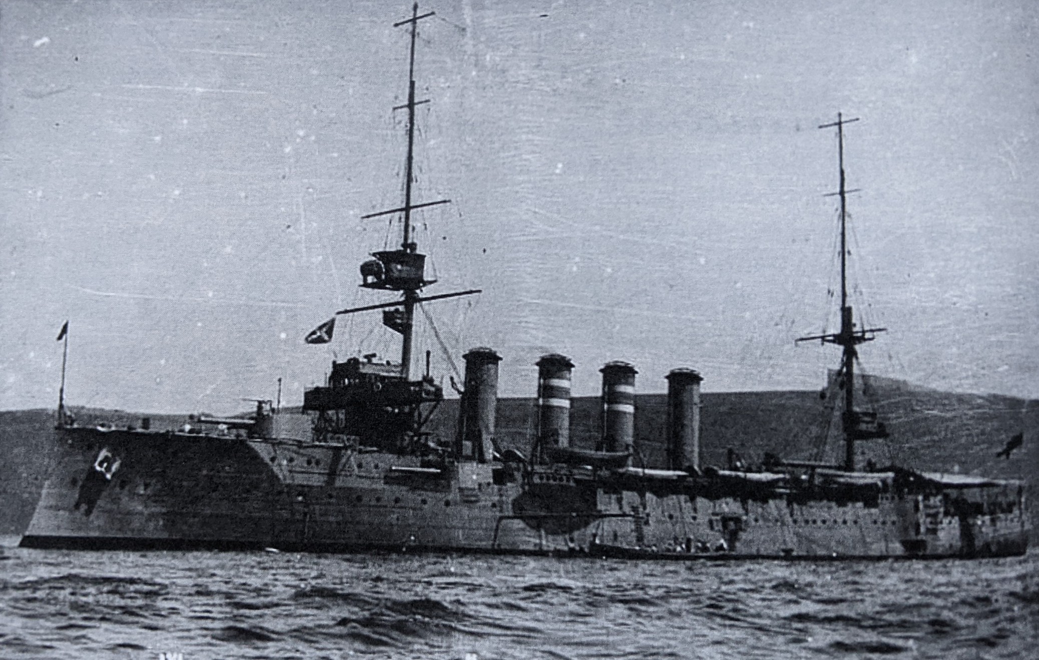 10,700 tons. Speed 22.25 knots. Armament: four 7.5in guns, six 6in guns, two 2 pounder guns, twenty-two 3 pounder guns and two maxims plus two 18-inch torpedo tubes.
