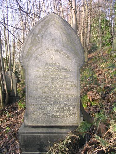 “Not my will Lord, but thine” Also the above Sarah Binns, who Died March 28th 1903, aged 63 years. Also the above John Binns, who Died August 4th 1905, aged 67 years. “Blessed are the dead, which die in the Lord” Also Dyson Beuamont, grandson of the above, who fell in action in France, June 16. 1917, aged 22 years. |
