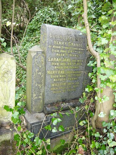 Grave 240 GRANGE In Loving Memory of Henry Grange of Wood Street, Longwood Died Nov. 24th 1915 aged 71 years. Sarah Jane, his wife, Died Dec. 25th 1914, aged 68 years. Mary Ann their daughter Died Aug.16th 1913 aged 41 years. William their son Died May 4th 1934 aged 55 years.