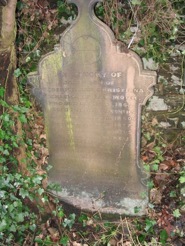 Grave 257 SHACKLETON In Memory of James son of Frederick and Christiana Shackleton of Leymoor who Died Dec. 16th 1865, aged 1 year & 4 months. Also of Moore their son