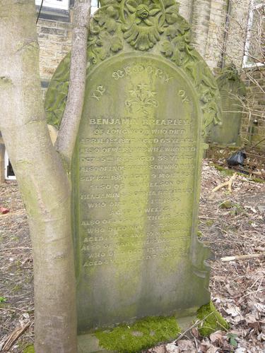 Grave 260 BREARLEY In Memory of Benjamin Brearley, of Longwood, who Died April 1st 1877, aged 63 years. Also of Mary, his wife who Died Octr. 5th 1852, aged 38 years. Also of Enos their son who Died Sep. 12th 1850, aged 9 months. Also of Samuel, son of Benjamin & Sophia Brearley who Died July 1st 1855, aged 10 weeks. Also of Joseph, their son who Died Novr. 8th 1864, aged 1 year and 10 months. Also of Mary, their daughter who Died Decr. 13th 1864, aged 4 years and 7 months.