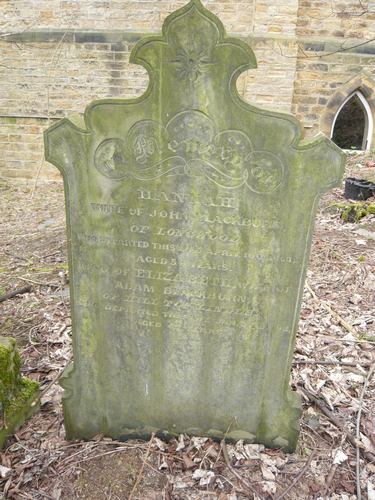 Grave 265 BLACKBURN In Memory of Hannah, wife of John Blackburn, of Longwood, who departed this life April 10th 1864, aged 58 years. Also of Elizabeth, wife of Adam Blackburn, of Hill Top, Lindley, who departed this life Jan. 27th 1892 aged 67 years.