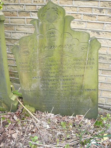 Grave 292 BERRY In Memory of Tom, son of Joseph & Martha Berry, of Longwood, who Died Feby 13th 1858 aged 10 years & 5 months. Also of the above named Joseph Berry, Born July 23rd 1815, Died Febry 26th 1878. Also of 9 children who Died in their infancy. Also of the above named Martha Berry, Born May 12th 1818, Died June 16th 1903. “Not my will Lord, but thine”