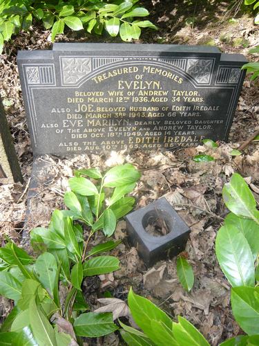 Grave 91 TAYLOR Treasured Memories of Evelyn, beloved wife of Andrew Taylor, Died March 12th 1936, aged 34 years. Also Joe, beloved husband of Edith Iredale Died March 3rd 1943, aged 66 years. Also Eve Marilyn, dearly loved daughter of the above Evelyn & Andrew Taylor Died Oct. 18th 1949, aged 14 years. Also the above Edith Iredale Died Aug. 10th 1965, aged 86 years.
