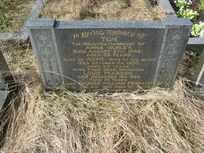 Sec 10 No 16 VARLEY PEARSON In Loving Memory of Tom, the beloved husband of Annie Varley, died August 27th 1942, aged 60 years Also of Annie wife of the above died October 11th 1950, aged 65 years Also their dear daughter Louie Pearson, died December 18th 1992, aged 76 years Also George William Pearson, died Jan 21st 1997, aged 87 years “Worthy of remembrance”