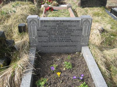 Sec 10 No 27 GARTSIDE In Affectionate Remembrance of Janie, the dearly beloved wife of John Gartside, who died October 17th 1940, aged 57 years Also the above named John Gartside, who died May 30th 1976, aged 89 years Also their daughter Lilliam Gartside, who died May 15th 2004, aged 86 years “I know that my redeemer liveth”