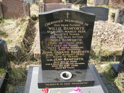 Sec 10 No 40 BAMFORTH Cherished Memories of Our dear father Willie Bamforth, died 26th March 1938, aged 43 years And our dear mother Nora Bamforth, died 10th June 1981, aged 85 years Also a dear husband, and dad and grandad John Garside Bamforth, died 19th August 1995, aged 71 years Also Jean Bamforth, dear wife of John and a dear mother and grandma died 11th Sept. 2008, aged 82 years “Always in our thoughts”