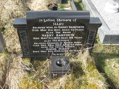 Sec 10 No 47 BAMFORTH HIRST In Loving Memory of Mary beloved wife of Harry Bamforth died May 11th 1937, aged 58 years Also the above Harry died May 5th 1949, aged 68 years Also Herman beloved husband of Annie Hirst died Dec. 28th 1954 aged 62 years Also the above named Annie HIrst died May 21st 1993, aged 89 years “At rest”