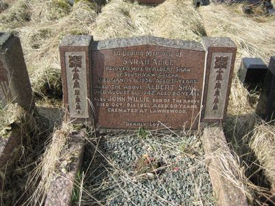 Sec 10 No 52 SHAW In Loving Memory of Sarah Alice beloved wife of Albert Shaw of South View, Golcar, died Jan. 14th 1936, aged 71 years Also the above Albert Shaw, died August 6th 1942, aged 80 years Also John Willie, son of the above died Oct. 9th 1951, aged 50 years Cremated at Lawnswood “Dearly loved”