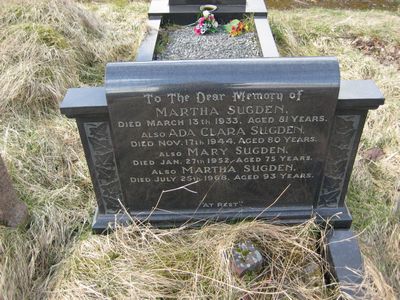 Sec 10 No 65 SUGDEN To the Dear Memory of Martha Sugden, died March 13th 1933, aged 81 years Also Ada Clara Sugden, died Nov. 17th 1944, aged 80 years Also Mary Sugden, died Jan. 27th 1952, aged 75 years Also Martha Sugden, died July 25th 1968, aged 93 years “At rest”