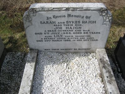 Sec 10 No 68 HAIGH In Loving Memory of Sarah and Sykes Haigh. Also their son, Joe Haigh a dear husband and dad, died 5th July 1985, aged 66 years Also Lily, their daughter a dearly loved sister and aunt, died 23rd March 1988, in her 90th year “May their memory be blessed”