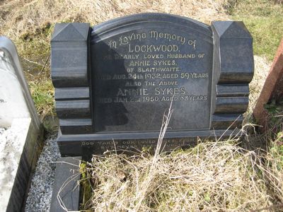 Sec 10 No 69 SYKES In Loving Memory of Lockwood, the dearly loved husband of Annie Sykes, of Slaithwaite died Aug. 24th 1932 aged 59 years Also the above Annie Sykes died Jan 2nd 1950 aged 68 years “God takes our loved ones from our side but never from our hearts” Also the aforesaid Joe Sykes, died July 22nd 1953, in his 76th year.