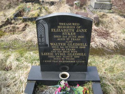 Sec 10 No 78 SYKES GLEDHILL Treasured Memories of Elizabeth Jane Sykes died 3rd June 1930 aged 57 years Also Walter Gledhill died 1st October 1988 aged 83 years And his dear wife Lizzie Sybil Gledhill died 18th Match 1989 aged 81 years “I know that my redeemer liveth”