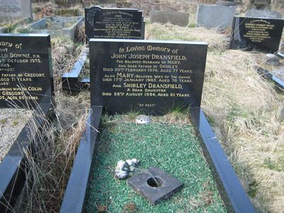Sec 11 No 10 DRANSFIELD In Loving Memory of John Joseph Dransfield, the beloved husband of Mary and dear Father of Shirley, Died 20th February 1974, aged 77 years Also Mary, beloved wife of the above Died 17th January 1983, aged 76 years And Shirley Dransfield, a dear daughter Died 28th August 1994, aged 61 years “At rest”