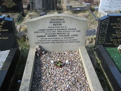 Sec 11 No 12 TILSON Treasured Memories of Kevin dearly loved son of James Henry & Maureen Tolson bron April 15th 1961 Died August 11th 1969 In Loving Memory of James Henry Tolson (Joe) dearly loved husband of Maureen a beloved dad, garndad and great-granddad born 22nd May 1933 Died 7th December 2006