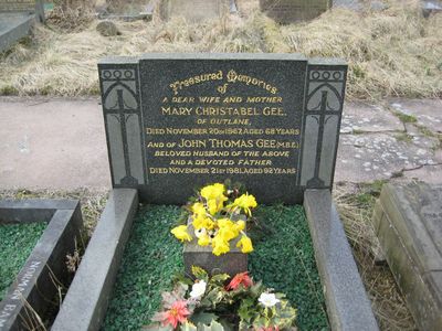 Sec 12 No 23 GEE Treasured Memories of a dear wife and mother Mary Christabel Gee, of Outlane, Died November 20th 1967, aged 68 years And of John Thomas Gee [M.B.E.] beloved husband of the above and a devoted father Died November 21st 1981 aged 92 years