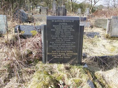 Sec 2 No 12 ARMITAGE In Loving Memory of James beloved husband of Clara Armitage died March 28th 1938 aged 73 years Also the above Clara Armitage died May 27th 1944 aged 78 years Also Vincent their son & beloved husband of Beatrice Annie Armitage died Feb 17th 1930 aged 40 years Also the above named Beatrice Annie Armitage died Feb 24th 1977 aged 86 years