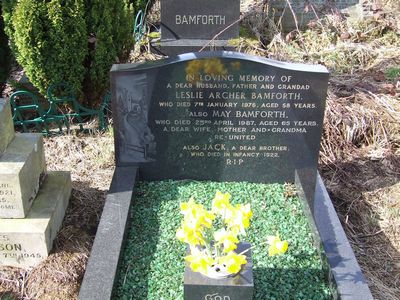 Sec 2 No 20 BAMFORTH In Loving Memory of A dear husband, father and grandad Leslie Archer Bamforth who died 7th January 1976 aged 58 years Also May Bamforth who died 23rd April 1987 aged 65 years A dear wife, mother and grandma Re-united Also Jack, a dear brother who died in infancy 1922 RIP |