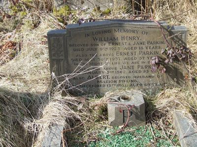 Sec 2 No 23 PARKIN PILLING In Loving Memory of William Henry beloved son of Ernest & Jane Parkin died July 9th 1923 aged 18 years Also the above Ernest Parkin died May 30th 1937 aged 57 years “In the midst of life we are in death” Also the above Jane Parkin died January 3rd 1962 aged 83 years Also Albert beloved husband of Marion Pilling died December 13th 1971 aged 69 years