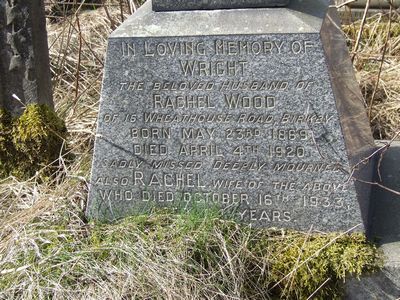 In Loving Memory of Wright the beloved husband of Rachel Wood pf 16 Wheathouse Road, Birkby born May 23rd 1869 died April 4th 1920