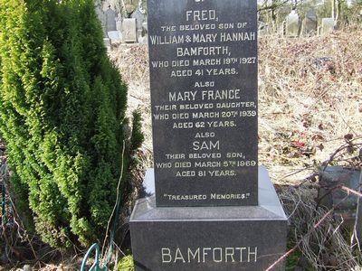 Sec 2 No 33 BAMFORTH In Loving Memory of Fred the beloved son of William & Mary Hannah Bamforth who died March 19th 1927 aged 41 years Also Mary France their beloved daughter who died March 20th 1939 aged 62 years Also Sam their beloved son who died March 5th 1969 aged 81 years “Treasured Memories” BAMFORTH