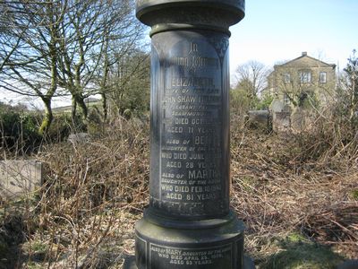 Sec 3 No 3 FIELDING In Loving Memory of Elizabeth, wife of the late John Shaw Fielding, of Pleasant Pastures, Scammonden, who died Oct 19. 1910 aged 71 years Also of Betty, daughter of the above who died June 27. 1898 aged 28 years Also of Martha daughter of the above who died Feb. 10. 1940 aged 81 years Also of Mary, daughter of the above who died April 25. 1939, aged 63 years “A good wife, a good mother, she looketh well to the ways of her household and eateth not the bread of idleness” “Worthy of remembrance”