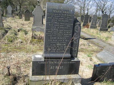 Sec 3 No 59 AINLEY WOOD In Loving Memory of Mary Ann beloved wife of Sam Ainley of Scape Goat Hill who died June 29. 1910, aged 55 years Also Ethel, their daughter who died Jan 1. 1888 aged 10 months Also Gertie, their daughter who died Dec. 31. 1895 aged 2 years & 5 months Also the above named Sam Ainley, who died Jan 8. 1914, aged 55 years Also Miriam, daughter of the above and wife of Clegg Wood, who died May 6. 1942, aged 59 years Also their daughter Florence Irene Wood, who died I infancy “At rest”
