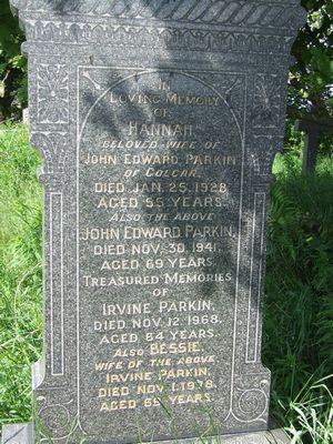 Sec 5 No 17 PARKIN In Loving Memory of Hannah beloved wife of John Edward Parkin of Golcar Died Jan 25. 1928 aged 55 years Also the above John Edward Parkin Died Nov 30. 1941 aged 69 years Treasured Memories of Irvine Parkin died Nov 12. 1968 aged 64 years Also Bessie wife of the above, died Nov 1. 1978 aged 69 years