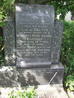 Also of MARY wife of the above Walter Ramsden Also Elaizabeth beloved daughter of the above Died Jan 10th 1951 aged 67 years