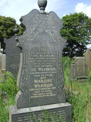 Sec 5 No 27 WILKINSON Until the day break In Loving Memory of Ethel the beloved wife of Joe Wilkinson Waverley House, Slaithwaite who died Oct 12. 1910 aged 27 years Also the above Joe Wilkinson who died March 25. 1943 aged 59 years Also Marjorie Wilkinson Who died March 26. 1987 aged 75 years the dearly loved daughter of the above