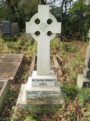 Sec 5 No 60 HOYLE In Loving Memory of Doris, beloved daughter of Anthony & Martha Hoyle of Woolroyd Died April 29. 1913, aged 15 years. Also the above Martha Hoyle, Died Feb. 5. 1937, aged 78 years. At Rest. Also Anthony, beloved husband of Martha Hoyle Died March 21. 1932, aged 73 years. Also Lawson, their son Died April 15. 1936, aged 52 years.