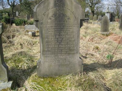Sec 6 No 13 BLACKBURN In Affectionate Remembrance of Herbert the beloved son of John & Hannah Blackburn of Carr Lane, Slaithwaite, born June 10th 1886, died Jan 14th 1892 Also of the above named John Blackburn who died Sep. 18th 1916 aged 75 years Also of the above named Hannah Blackburn who died June 18th 1922, aged 77 years “Blessed are the dead which die in the Lord” Rev. 14 ch 13 v Also Annis, daughter of the above who died October 18th 1950, aged 82 years