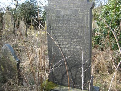 Sec 6 No 28 WOOD In Loving Memory of George, the beloved husband of Mary Jane Wood of Neatherend Rd, Slaithwaite, died September 22nd 1925, aged 67 years Also of the above Mary Jane Wood, died January 15th 1932, aged 71 years Also of Annie, beloved daughter of the above died May 13th 1893, aged 6 years