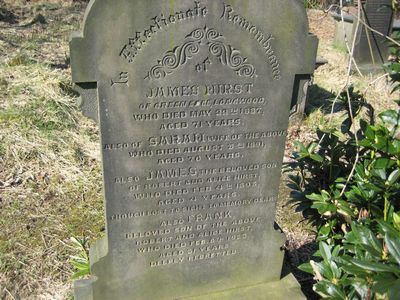 Sec 6 No 63 HIRST In Affectionate Remembrance of James Hirst of Green Edge, Longwood, who died May 22nd 1887, aged 71 years Also Sarah wife of the above who did August 3rd 1891, aged 70 years Also James, the beloved son of Robert and Alice Hirst, who died Feb. 4th 1893, aged 4 weeks Also Frank, beloved son of the above Robert and Alice Hirst, who died Feb. 6th 1923, aged 31 years “Deeply regretted”