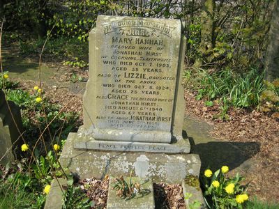 Sec 7 No 18 HIRST In Loving Memory of Mary Hannah Beloved wife of Jonathan Hirst of Cockring, Slaithwaite who died Oct 7th 1905 aged 35 years Also of Lizzie daughter of the above Who died Oct 8th 1924 aged 25 years Also Grace the beloved wife of Jonathan Hirst Died August 6th 1940 aged 67 years Also the above Jonathan Hirst Died June 3rd 1958 aged 87 years Peace Perfect Peace
