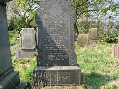 Sec 7 No 2 HAIGH TAYLOR In Loving Memory of Sarah the beloved wife of Edwin Haigh of Freehold, Golcar Who died Oct 17th 1905 aged 52 years Also the above Edwin Haigh Who died Dec 13th 1925 aged 73 years Also Fred the beloved husband of Regina Taylor Who died March 13th 1940 aged 63 years Also the above Regina Taylor Who died July 2nd 1941 aged 65 years At Rest