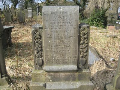 Sec 8 No 13 ARMITAGE In Loving Memory of Edwin, the beloved husband of Lois Armitage, of Bolster Moor, Golcar, who died July 23rd 1912, aged 61 years Also four children who died in infancy Also of Lois, wife of the above named Edwin Armitage, who died October 15th 1923, aged 74 years Also of Joseph, brother of the above Edwin Armitage, who died March 24th 1938, aged 72 years “Until the day break” “The Lord gave and the Lord hath taken away, blessed be the name of the Lord”