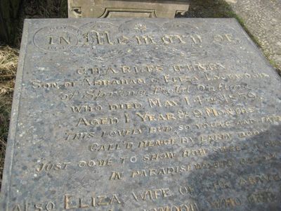 Sec 8 No 17 LOCKWOOD In Memory of Charles Henry son of Abraham & Eliza Lockwood of Spring Field, Outlane who died May 14th 1859 aged 1 year & 9 months “This lovely bud so young and fair, call’d hence by early doom, just gone to show how sweet a bud, in paradise would bloom” Also Eliza wife of the above named Abraham Lockwood who died Oct. 2nd 1880 aged 59 years Also of the above named Abraham Lockwood who died Sepr 16th 1914 aged 88 years Also of Susannah beloved wife of the above who died Oct 18th 1927 aged 73 years