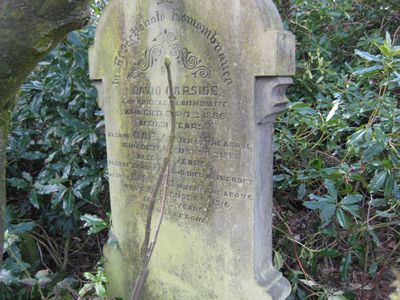 Sec 8 No 34 GARSIDE In Affectionate Remembrance of David Garside, of Crimble, Linthwaite who died Sep 7th 1886, aged 31 years Also of Mary, sister of the above who died August 29th 1886, aged 46 years Also of 2 children who died in infancy Also of Mary Ann, wife of the above who died August 6th 1916, aged 75 years “Thy will be done”