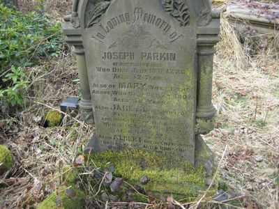 Sec 8 No 41 PARKIN POGSON In Loving Memory Joseph Parkin pf Nettleton Hill who died June 13th 1886 aged 52 years Also of Mary, wife of the above, who died Oct 2nd 1893 aged 58 years Also Jane, beloved wife of Albert Pogson, and daughter of the above who died Sept 21st 1957 aged 82 years Also Albert, beloved husband of Jane Pogson, who died Jan 1st 1959 aged 86 years “Thy will be done”