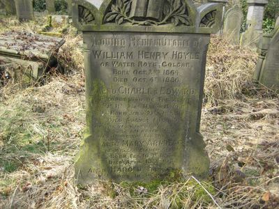 Sec 8 No 43 HOYLE ARMITAGE In Loving Remembrance of William Henry Hoyle, of Water Royd, Golcar, born Oct. 2nd 1864, died Oct. 4th 1886 Also Charles Edward, beloved son of the above Wm Hy and Mary Hoyle, born July 21st 1883, died August 24th 1899. We are troubled we are bowed down greatly we are mourning all the day long. Also Mary Armitage, of Waller Clough, Golcar born Feb 18th 1864, died April 13th 1932 Also Harold, their grandson died in infancy