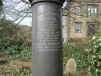 Sec 9 No 22 PARKIN In Loving Memory of Martha beloved wife of David Parkin, of Nettleton Hill, Longwood died Dec 25. 1912 aged 66 years “Thy will be done” Also the above David Parkin, died Nov. 11. 1930 aged 84 years Also of Sarah, their daughter died Oct 14. 1890, aged 19 years Also of Herbert, their son died June 4. 1882, aged 2 years