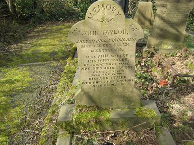 Sec 9 No 40 TAYLOR In Memory of John Taylor, of Wilson Hill, Stainland, who died Dec. 15th 1880, aged 75 years Also Ann, wife of Richard Taylor. of Scape Goat Hill, who died June 8th 189,7 aged 78 years Also the above Richard Taylor, who died April 5th 1907 aged 85 years