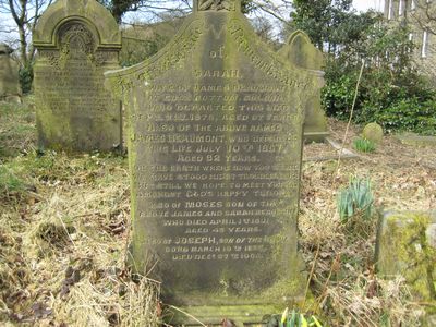 Sec 9 No 5 BEAUMONT In Affectionate Remembrance of Sarah wife of James Beaumont of Edge Bottom, Golcar, who departed this life Sept 21st 1878, aged 67 years Also the above named James Beaumont who departed this life July 10th 1887, aged 82 years “On the earth where now you stand, we have stood midst trouble long, but still we hope to meet you amongst God’s happy throng” Also of Moses, son of the above James and Sarah Beaumont who died April 1st 1891, aged 43 years Also of Joseph, son of the above born March 10th 1875 died Decr 27th 1906