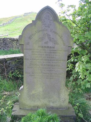 Grave A120 BAMFORTH In Affectionate Remembrance of Hannah daughter of John and Sarah Bamforth of Birks, Slaithwaite, who died November 1st 1858 aged 17 years. Also 2 children who died in infancy. Also the above named John Bamforth who Died August 22nd 1902 aged 80 years. Also Sarah, wife of the above who Died April 22nd 1904 aged 81 years.