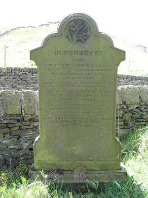 Grave A126 WILKINSON In memory of John son of Joseph and Elizabeth Wilkinson of Ewse Scammonden who Died August 24th 1872 aged 22 years Be ye also ready for in such an hour as Ye think not the son of man cometh. Also of the above Joseph Wilkinson who Died February 9th 1891 aged 69 years Also of Elizabeth his wife who Died March 19th 1901 aged 71 years. Also of Sarah daughter of the above who Died April 20th 1903 aged 45 years.