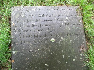Grave A38 BARRON Here Lieth the body of Lydia the wife of Joseph Barron of Gosper in Stainland who died January 24th 1808 in the 38th year of her age. Also of John the son of the said Joseph died aged one year. Thomas Barron (inscribed at the foot of the stone)