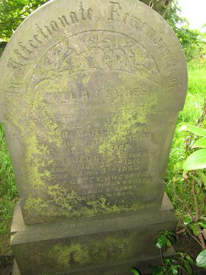 Grave A72 SYKES In Affectionate Remembrance of William Sykes of Green Lane Slaithwaite who died March 27th 1853 aged 79 years. Also of Martha his wife died Aug 8th 1860 aged 83 years. Also of Rufus son of the above born May 28th 1819 died March 8th 1892. Also of Betty wife of the above named Rufus born March 9th 1827 died Decr 18th 1904. |