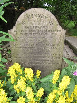 Grave A8 CLAY In Memory of Dan Edward, son of Wright and Elizabeth Clay of Nettleton Hill, who died Novr 10th 1864 aged 3 years. Also of Betsy their daughter who died March 19th 1869 aged 4 years. Also of John Herbert son of the above who died April 10th 1874 aged one year and 9 months. Also of Lydia Alice daughter of the above who died Feb 10th 1877 aged 7 months. Also of John Wilfred son of the above who died November 28th 1886 aged 6 years 7 months. Also a son who died in infancy.