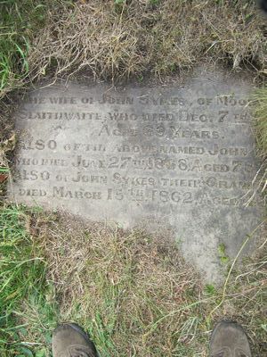 Grave A86 SYKES In Memory of Alice the wife of John Sykes of Moorfield, Slaithwaite died 7 Dec. 7th1861 aged 69 years. Also of the above named John who died June 27th 1868 aged 78 years. Also of John Sykes their grandson Died March 15th1862 aged 4 years.